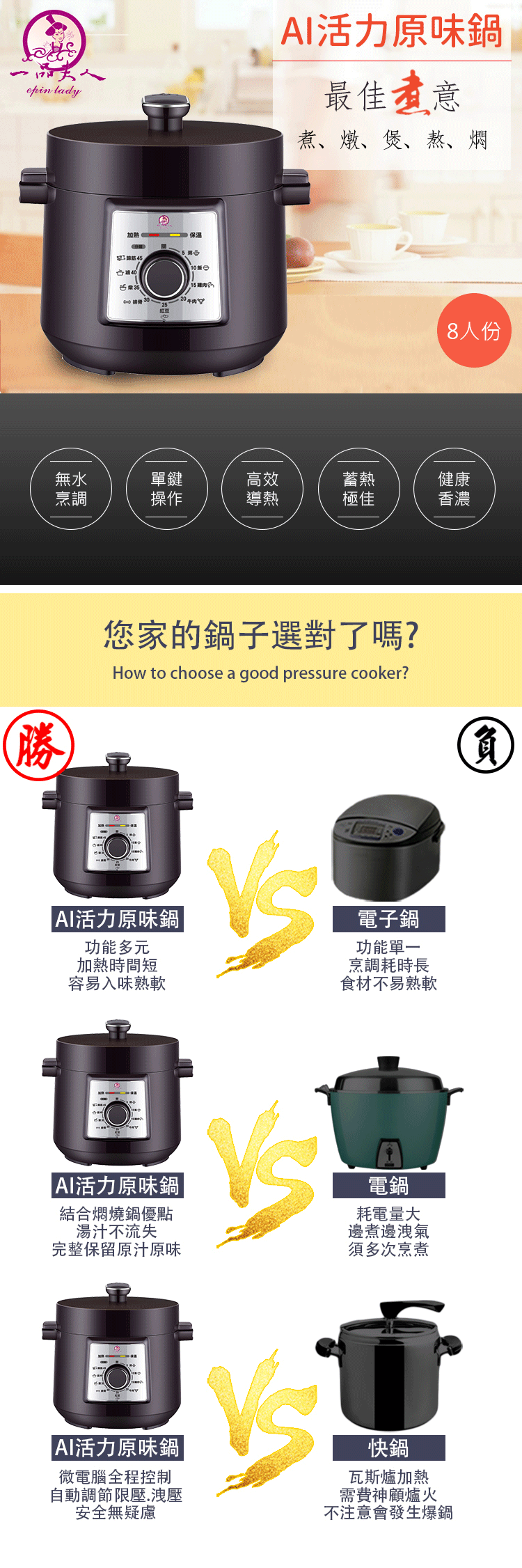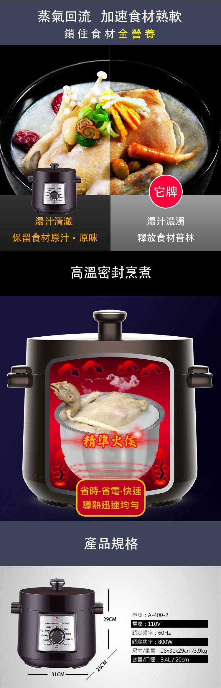 *微電腦控制,選擇菜單鍵後,自動完成烹飪過程,且有定時、保壓及停電記憶功能。 (3)可無水料理,增加不一樣的料理方式豐富並改變三餐的變化。