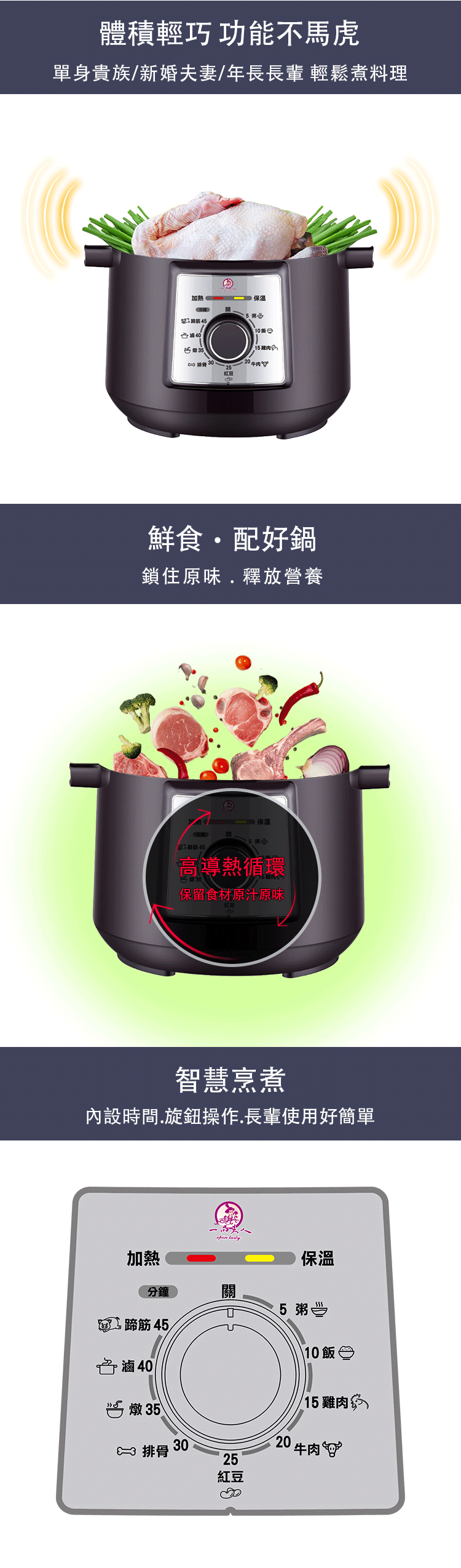 *一鍋多用,具煮、熬、燉、燜燒等烹飪功能,集合電子鍋、壓力鍋、燜燒鍋的優點。