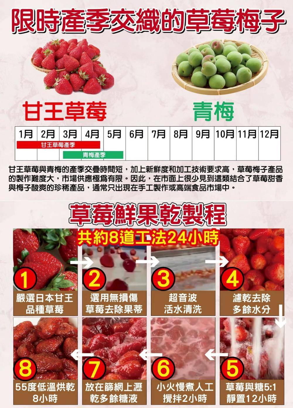商品詳情 外銷日本草莓梅子限量組-大組 草莓梅子45g/包*20包完全去籽食用方便 酸甜解膩好滋味 獨立隨手包,衛生方便 主商品:草莓梅子45g/包 主成分:青梅、高果糖糖漿、糖、草梅乾(草莓、糖、 麥芽糖、檸檬酸、漂白劑(偏亞硫酸氫鈉)、食用紅色六 號、香料)、鹽、檸檬酸、冰醋酸、甜味劑(甜菊醣苷、 蔗糖素)、防腐劑(己二烯酸鉀)、香料 外銷日本草莓梅子限量組-大組 TWD $2,200 TWD $2,200