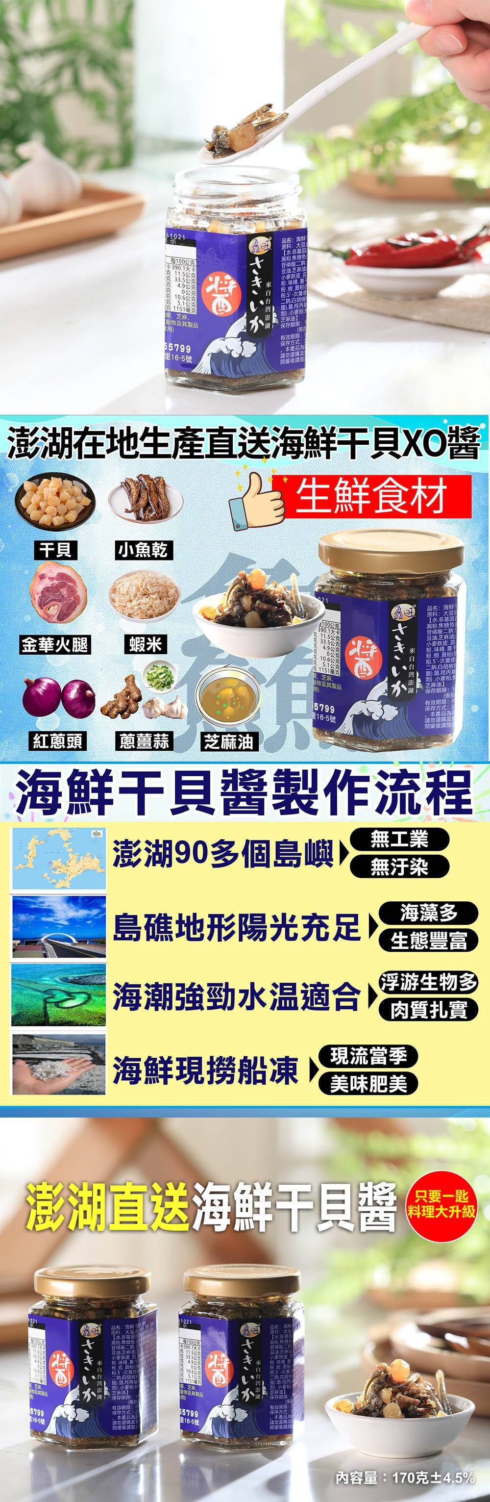 商品詳情 澎湖直接海鮮干貝醬大組(無辣) (開放1罐體驗) 海鮮干貝醬(無辣)170g±4.5% X 10罐 贈品:海鮮干貝醬(無辣)170g±4.5% X2罐 品名:海鮮干貝醬(無辣)成分:大豆油、小魚乾、蒜頭、蘿蔔乾、豆瓣醬【水、非基因改造黃豆、小麥、食鹽、乙醯化己二酸二澱粉、焦糖色素、甜味劑(醋磺內酯鉀)、5’-次黃嘌呤核苷磷酸二鈉、5’-鳥嘌呤核苷磷酸二鈉、香料、香油(大豆油、芝麻油)】、干貝、沙茶醬【黃豆油、狗母魚、南薑粉、蒜、小麥麩皮、蔥酥(蔥頭、棕櫚油、玉米澱粉)、芝麻粉、味精、蔥干、椰子粉、蝦、薑粉(薑員、麥芽糊精)、鹽、咖哩粉、辣椒、豆蒄粉、5’-次黃嘌呤核苷磷酸二鈉、5’-鳥嘌呤核苷磷酸二鈉、蝦米、蠔油、L-麩酸鈉(調味劑)、小麥粉、焦糖色素(著色劑)】、香油【大豆油、芝麻油】產地:台灣澎湖即食或拌炒皆可內容量:170克±4.5%保存期限:18個月(常溫未開封狀態且正常條件下之保存)有效日期:標示於標纖或瓶蓋(西元年 月 日)警語:本產品含有魚類、甲殼類、芝麻、大豆、堅果、含麩質之穀物及其製品(不適合其過敏體質者食用)保存方式 未開罐常溫下請置放陰涼處,勿放高溫炎熱場所,開罐後請務必放冰箱冷藏保存並盡速食用完畢! 澎湖直接海鮮干貝醬大組(無辣) TWD $1,900 TWD$ 1,900
