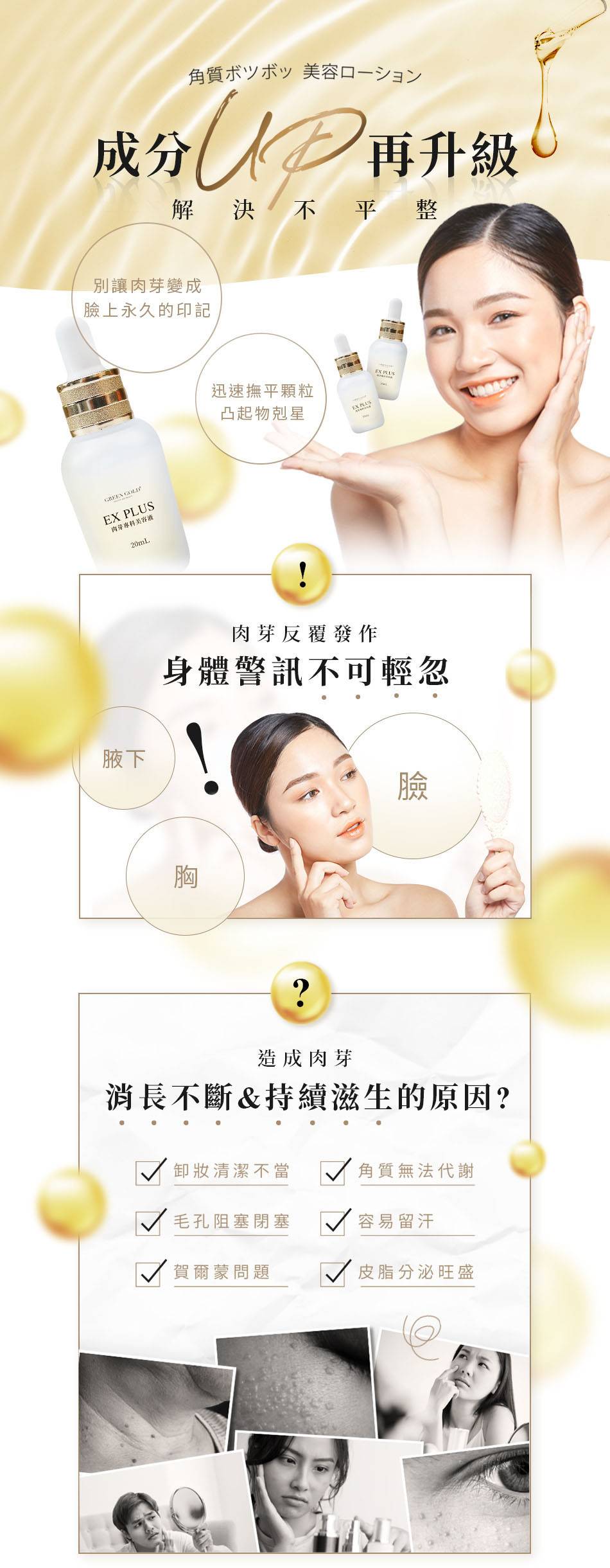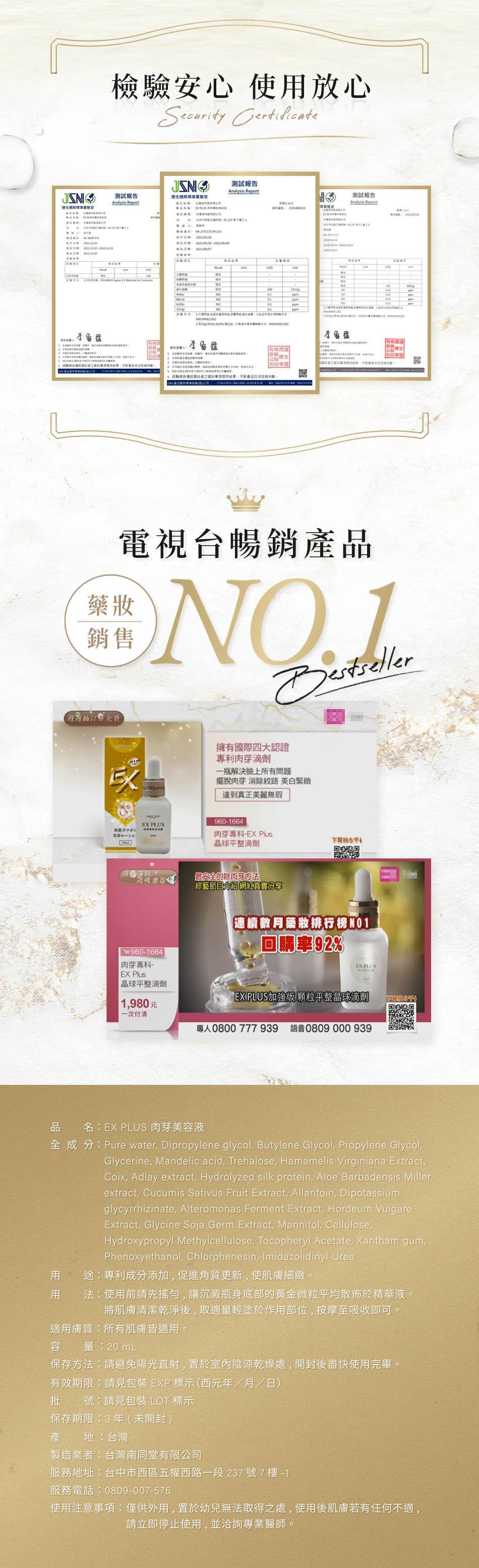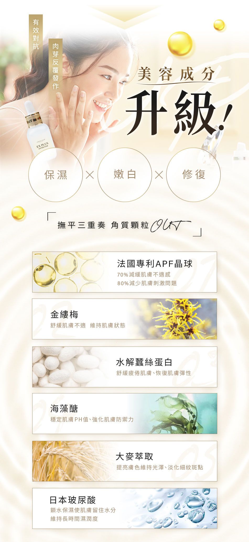 商品詳情 EX Plus肉芽專科美容液大組 (20ml/瓶)X6瓶日本獨家海藻糖法國原料專利APF肉芽專科植萃配方日本專利植物多胺 商品規格:EXPlus肉芽專科美容液(20ml/瓶)商品成分:純水、丙甘醇、丁二醇、丙二醇、甘油、交替單胞菌發酵產物萃取、海藻糖、薏苡、薏仁萃取、水解蠶絲蛋白、庫拉索蘆薈萃取、黃瓜果萃取、金縷梅萃取、甘草酸鉀、尿囊素、大麥提取、杏仁酸、大豆胚芽萃取、玻尿酸鈉、黃原膠、苯氧乙醇、氯苯甘醚。產地:台灣 EX Plus肉芽專科美容液大組 TWD $1,800 TWD$ 1,800