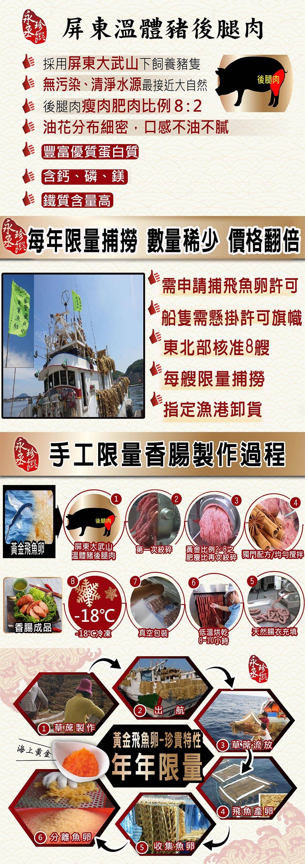 由於飛魚卵含有豐富的DHA,以及吃起來有卡滋卡滋的口感,被暱稱為"會在嘴巴跳舞的 香腸飛魚卵" 飛魚卵香腸結合後腿豬肉,口口嫩肉中帶有飛魚卵的甜脆,巧妙的結合了山珍與海味~ 只要簡單料理即可品嚐到極富創意的好滋味! 金黃美味是健康又美味的最佳選擇!!