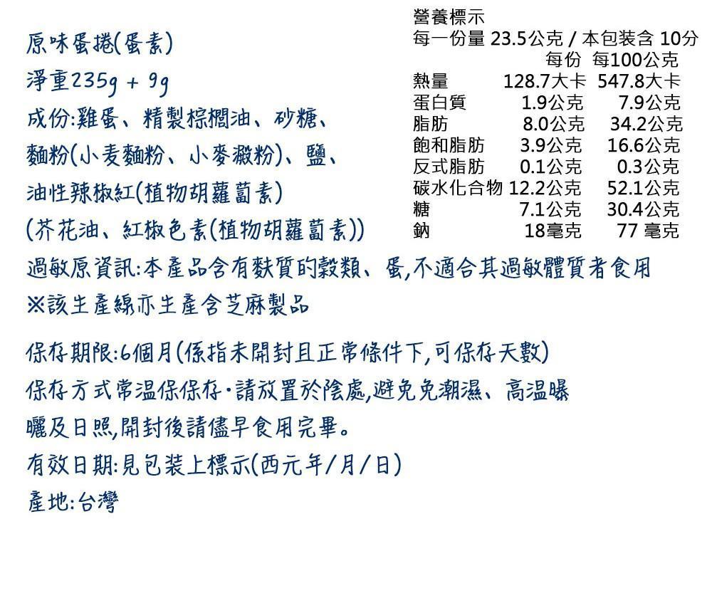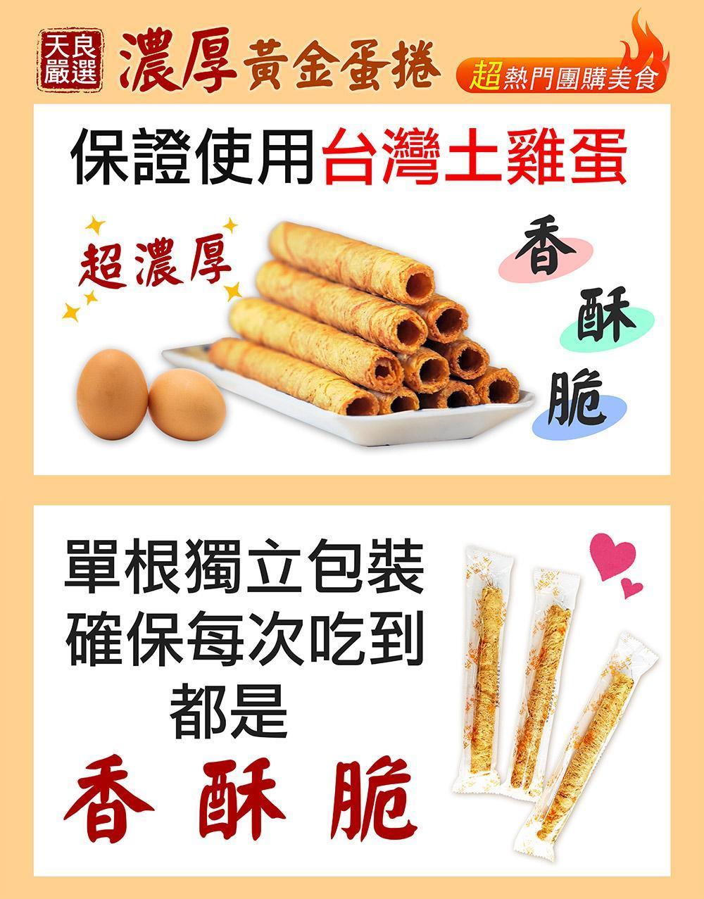 商品詳情 團購美食濃厚香酥蛋捲(235g±9g)x5包 採用動物福利標準稽核符合(平飼)飼養系統雞蛋口感厚實酥脆,一口接著一口...美味! 團購美食濃厚香酥蛋捲 5包/組 TWD $1,000 TWD $1,000