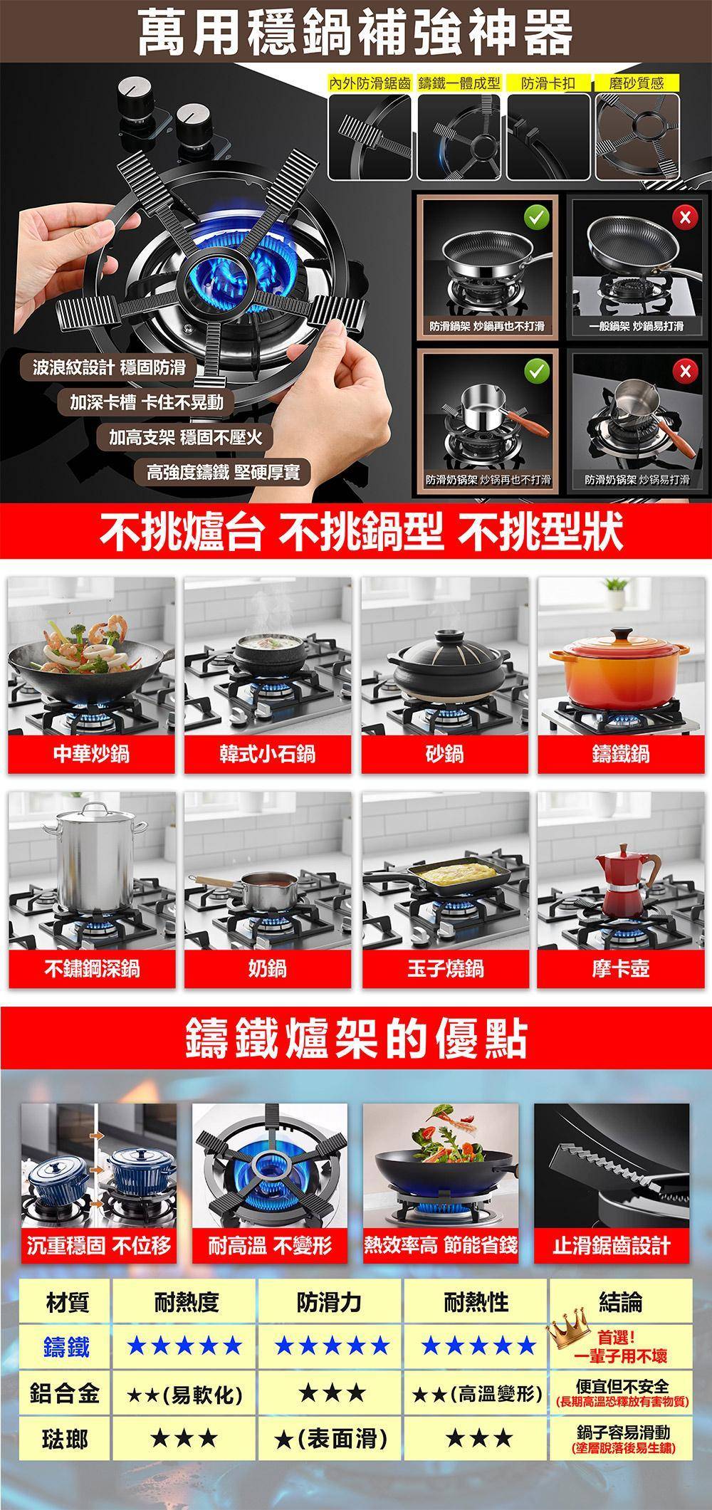 不挑鍋五爪鑄鐵萬用穩鍋神器
