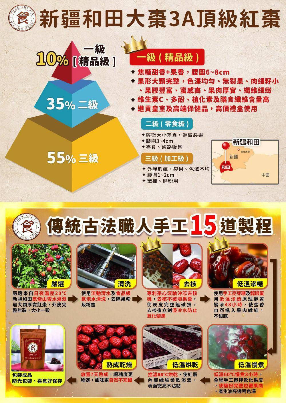 商品詳情 蓁食家宮廷點心新疆蜜紅棗搶購組 貴妃蜜棗(120g/包)*10包單顆獨立包裝、乾淨衛生,方便又即刻享用 紅棗營養價值豐富維生素C含量超高 單包重量: 120g±3%(包) 成分:紅棗.白砂糖.麥芽糖.蜂蜜 食品添加物:己二烯酸鉀(防腐劑) 產地:中國 蓁食家宮廷點心新疆蜜紅棗搶購組 TWD $990 TWD $990
